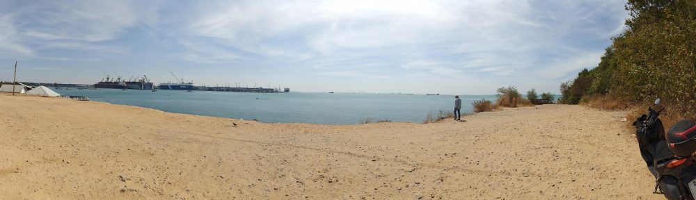 Herrlich unspektakulär. Bis hierhin war die Route top, bis ganz zum Aussichtspunkt müssen wir aber notgedrungen auch ein paar Kilometer über eine Hauptverkehrsstraße. Das ist aber nicht zu vermeiden. Der Aussichtspunkt liegt oberhalb vom Hafen auf einer Landzunge.